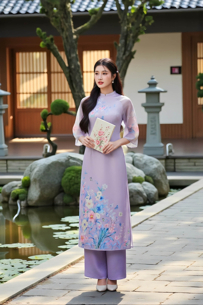 Phong cách thiết kế: Áo dài truyền thống với tay organza nhẹ nhàng và thân gấm in hoa chìm tạo nên sự cân bằng giữa mềm mại và sang trọng. Tay áo mỏng nhẹ giúp tổng thể uyển chuyển, trong khi thân gấm giữ phom dáng tốt, hoa văn chìm mang đến vẻ đẹp tinh tế