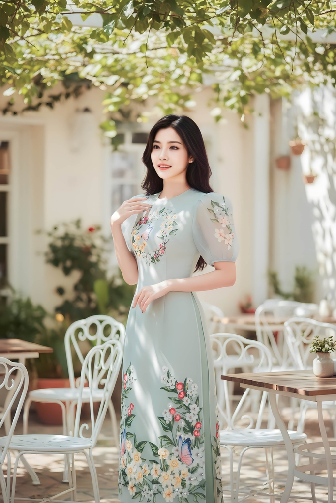 Phong cách thiết kế: Thiết kế giữ phom dáng áo dài truyền thống, khéo léo tôn lên những đường cong mềm mại và nét yêu kiều của người phụ nữ. Họa tiết hoa tinh tế in sắc nét, hòa quyện cùng ánh kim tạo nên vẻ đẹp vừa kiêu sa vừa tươi tắn