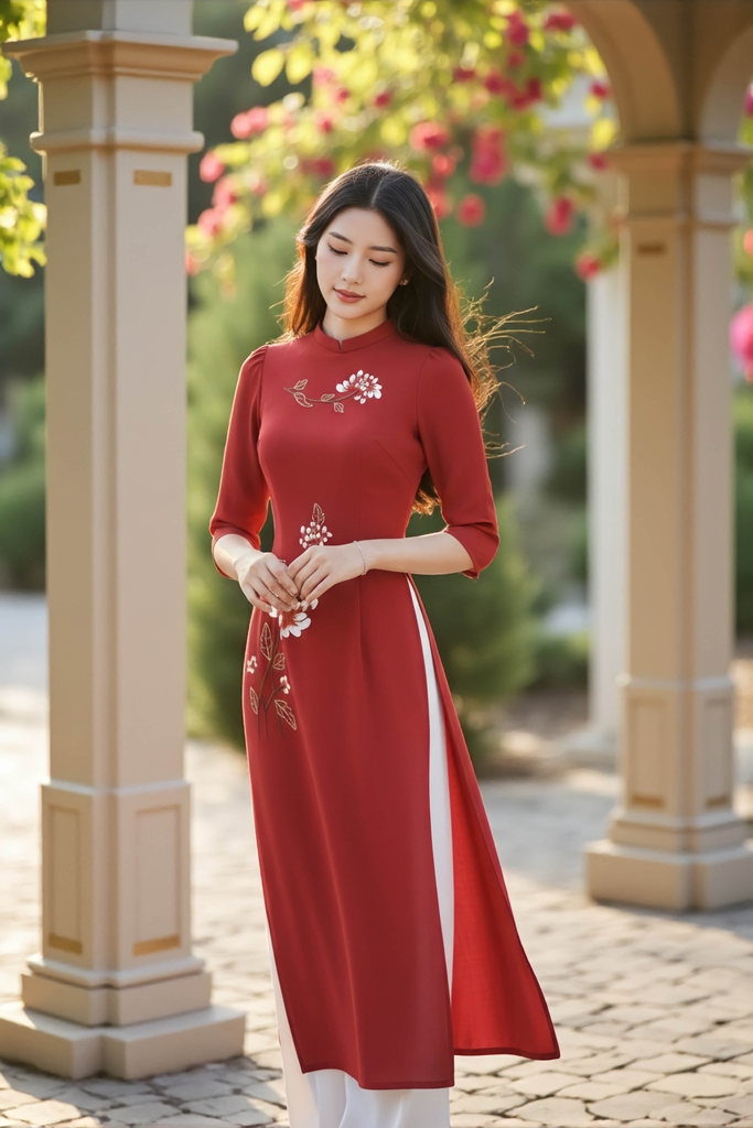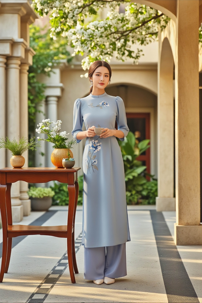 Phong cách thiết kế: Dáng áo dài cách tân với cổ tròn duyên dáng, kết hợp tay lỡ (tay 3/4) và chi tiết tay bồng nhẹ, mang lại vẻ trẻ trung, nữ tính. Họa tiết hoa lá được thêu tay thủ công vô cùng tỉ mỉ, sắc nét, trải dài tinh tế từ vai xuống tà áo, tạo nên điểm nhấn nghệ thuật độc đáo và sang trọng.