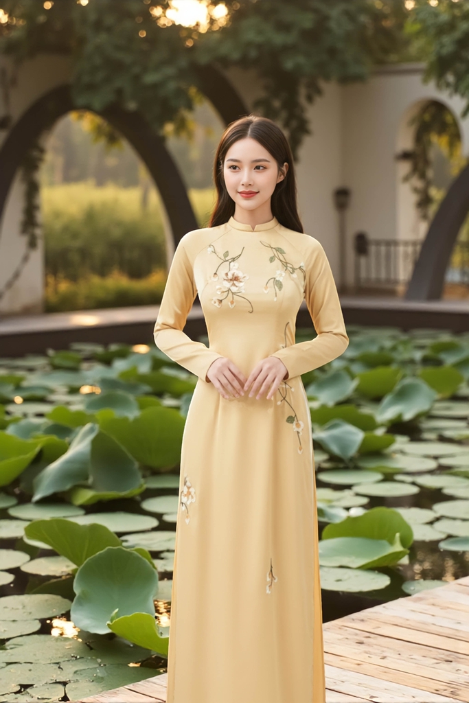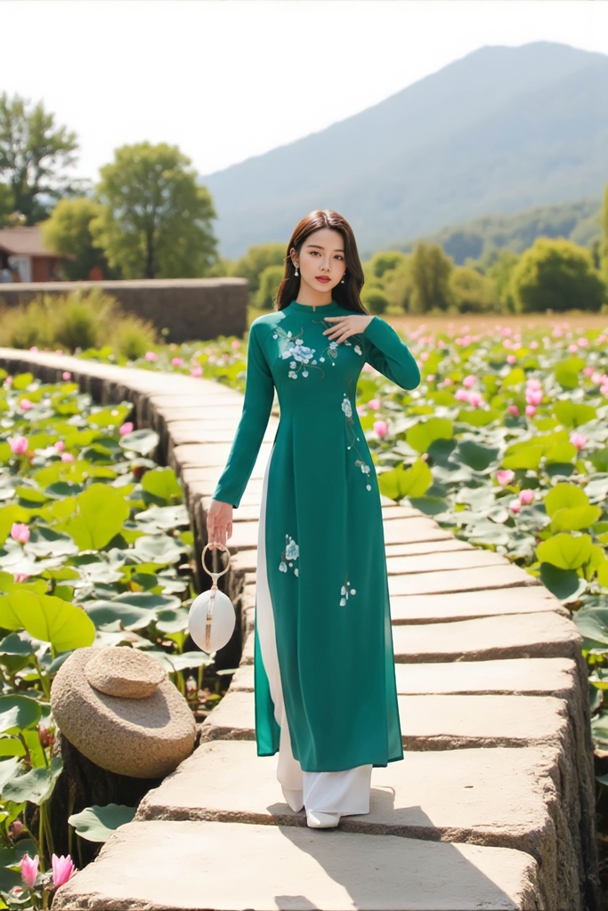 Phong cách thiết kế: Kiểu dáng áo dài truyền thống với cổ tàu thanh lịch và tay dài, ôm nhẹ nhàng, khéo léo tôn vinh đường nét duyên dáng của cơ thể. Họa tiết hoa được thêu tay thủ công vô cùng tỉ mỉ. Từng cụm hoa được sắp đặt tinh tế, trải dài duyên dáng từ vai xuống tà áo, tạo nên vẻ đẹp sang trọng và đầy tính nghệ thuật.