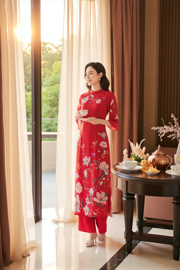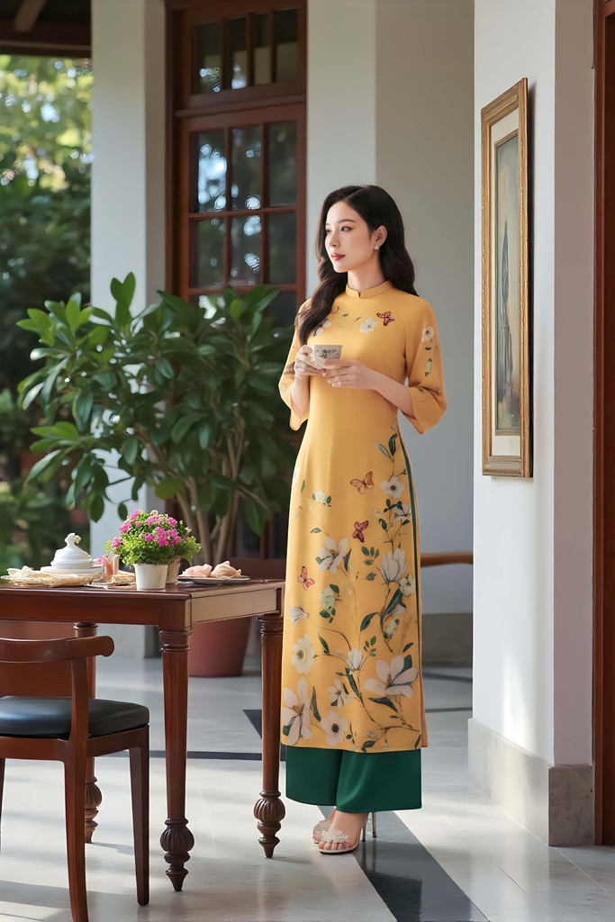 Phong cách thiết kế: Thiết kế giữ phom dáng áo dài truyền thống, khéo léo tôn lên những đường cong mềm mại và nét yêu kiều của người phụ nữ. Họa tiết hoa tinh tế in sắc nét, hòa quyện cùng ánh kim tạo nên vẻ đẹp vừa kiêu sa vừa tươi tắn