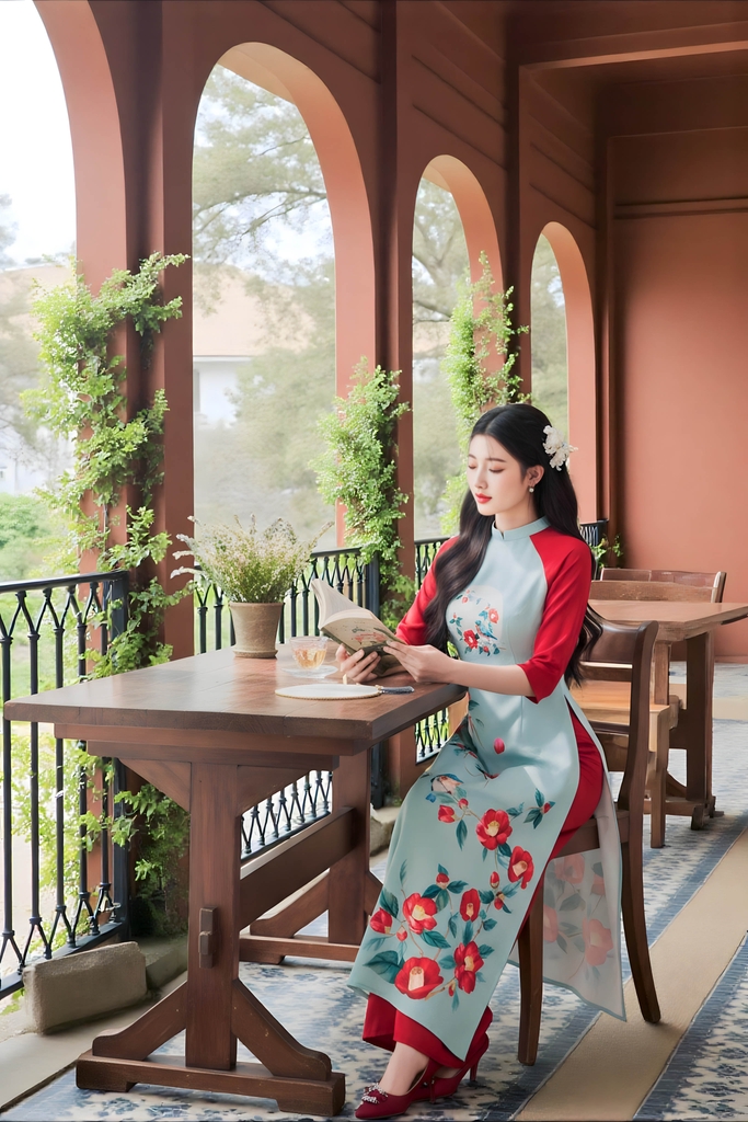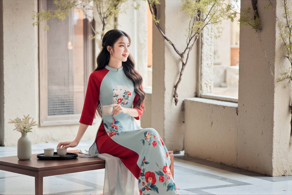 Phong cách thiết kế: Áo dài truyền thống kết hợp tay lụa Nhật mềm mại và thân gấm in hoa chìm tạo sự thanh lịch, nhẹ nhàng nhưng vẫn sang trọng. Lụa Nhật mang lại cảm giác mềm mịn, uyển chuyển, trong khi gấm giúp áo giữ phom dáng, hoa văn chìm tinh tế tạo điểm nhấn quý phái