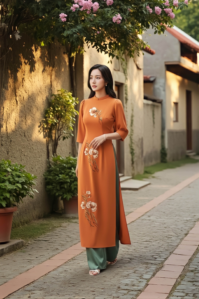 Phong cách thiết kế: Kiểu dáng cổ tàu truyền thống kết hợp cùng tay lỡ (tay 3/4) hiện đại, tạo nên vẻ đẹp thanh lịch, kín đáo mà vẫn trẻ trung. Họa tiết hoa to bản được thêu tay thủ công đầy nghệ thuật. Từng cụm hoa được sắp đặt khéo léo, trải dài tinh tế từ ngực xuống tà áo, tạo nên điểm nhấn độc đáo và vô cùng sang trọng.