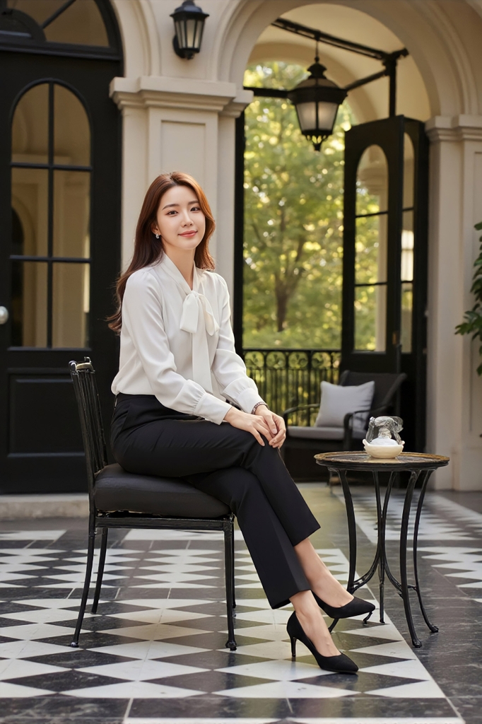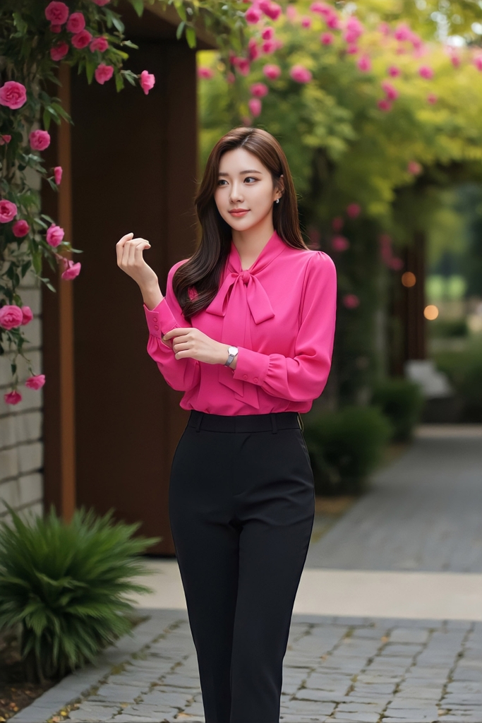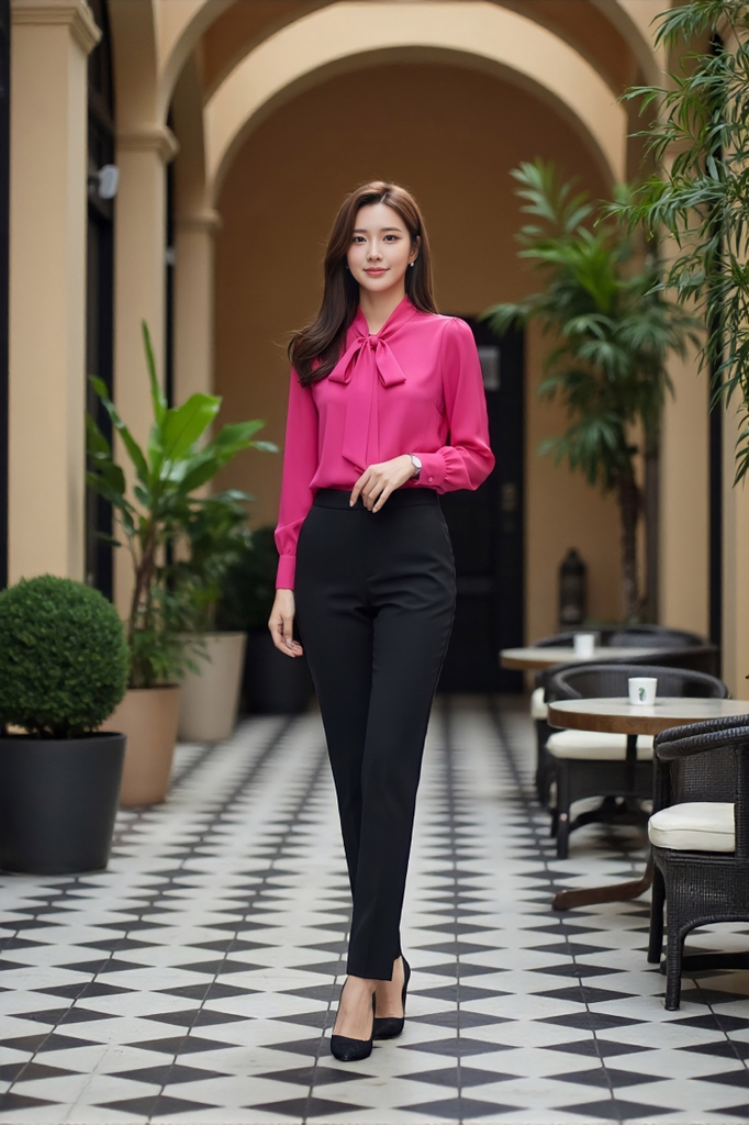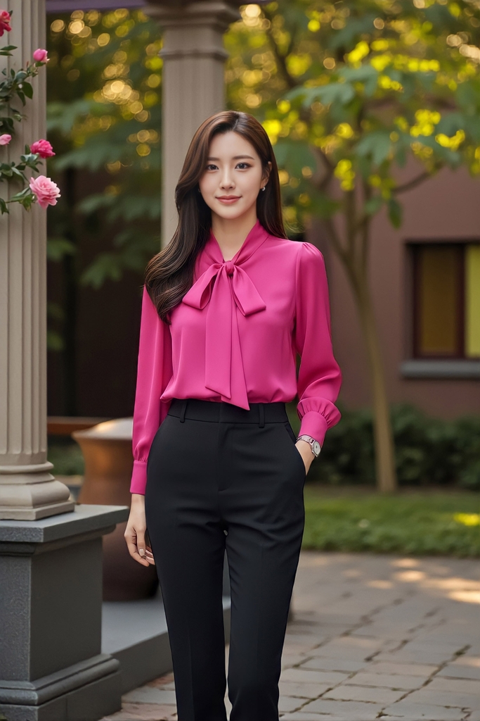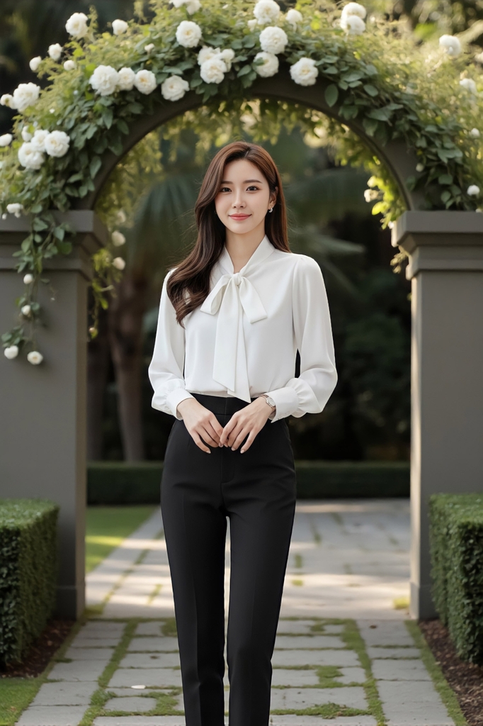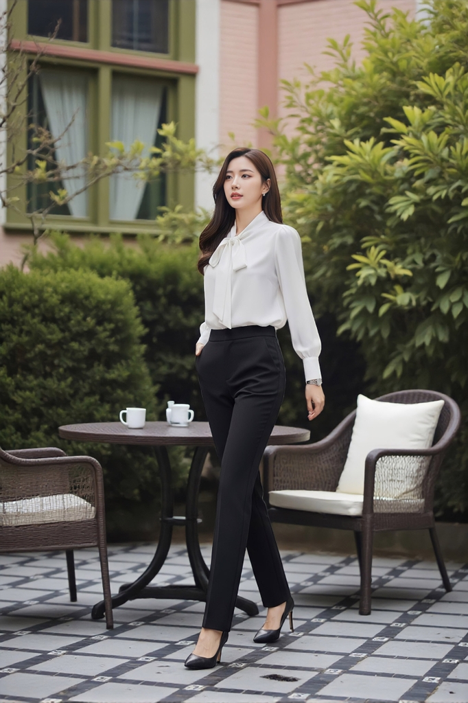 Cổ nơ cách điệu: Điểm nhấn duyên dáng, mang lại vẻ đẹp nữ tính, tri thức mà vẫn giữ được nét chuyên nghiệp của môi trường văn phòng.